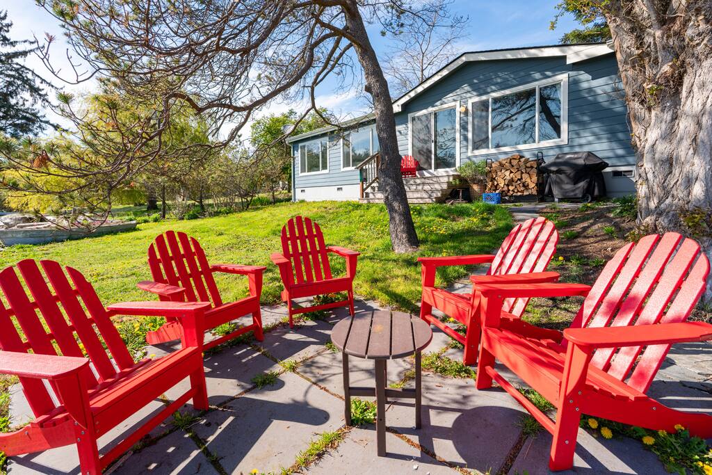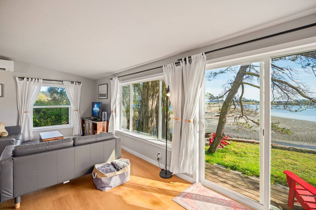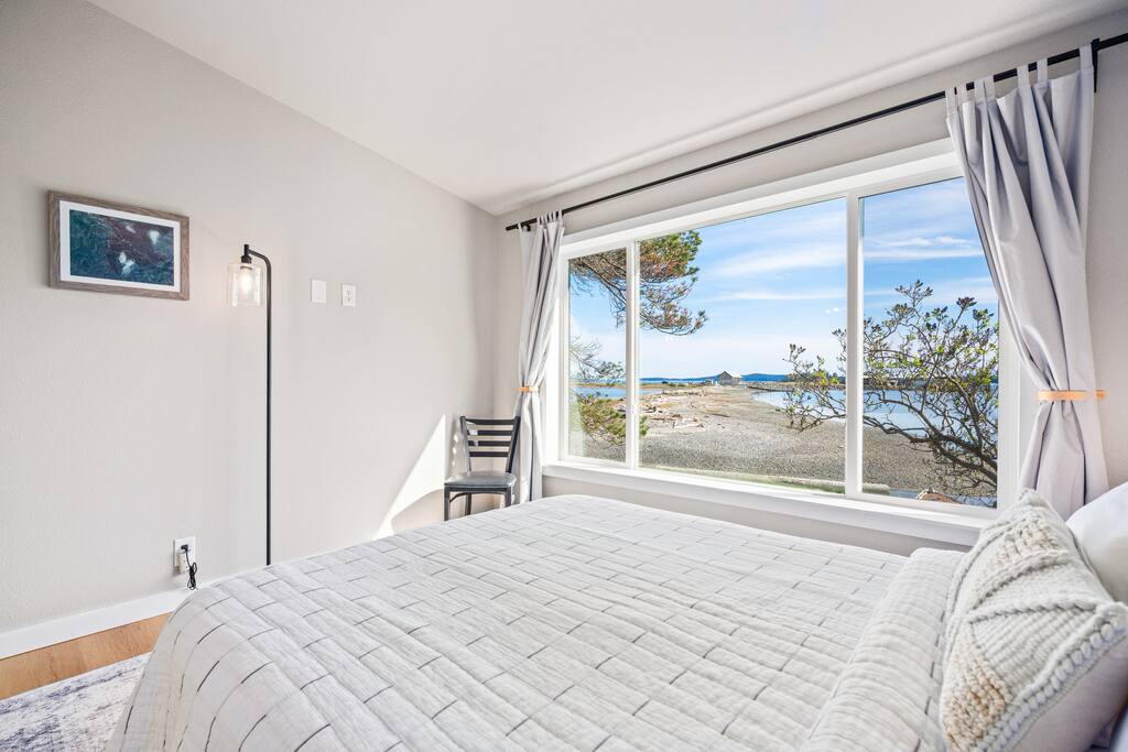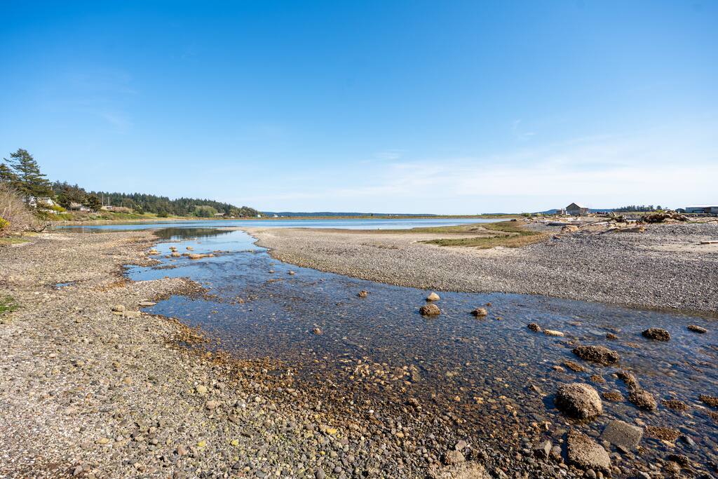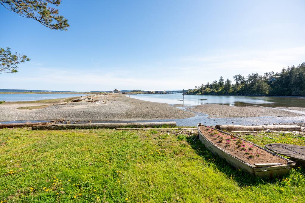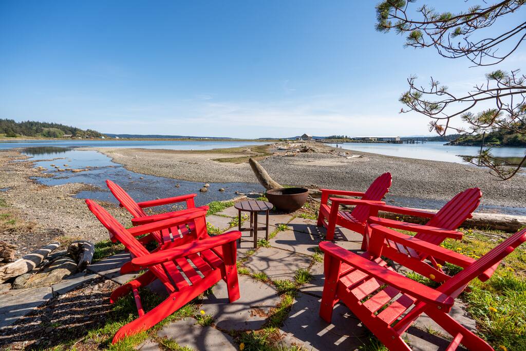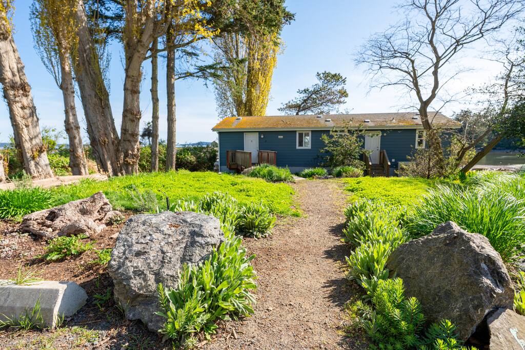 This two-bedroom cottage is just a mile from the town of Friday Harbor but offers a perfect way to get away from it all with a lush back yard that looks out over the bay with incredible views of Jackson Beach. At low tide you can step off the sea wall on the property and walk across to explore to your heart's content. When you're done with your day, the sound of gently running water outside will lull you to sleep Fiber internet connection allows your whole family to work or remote school.