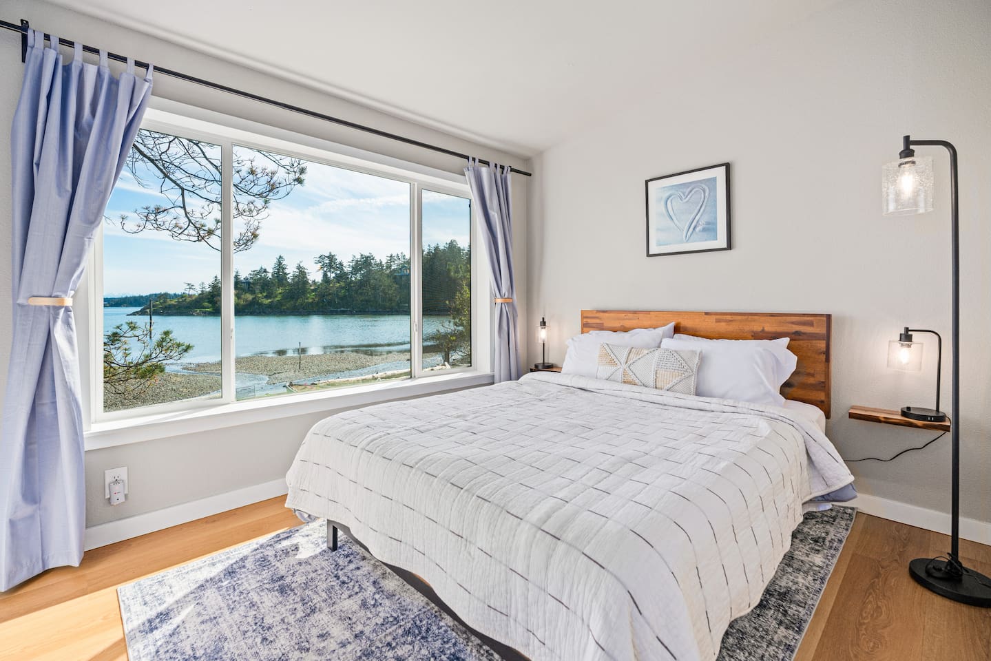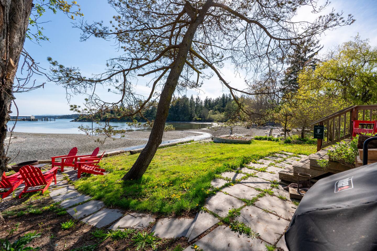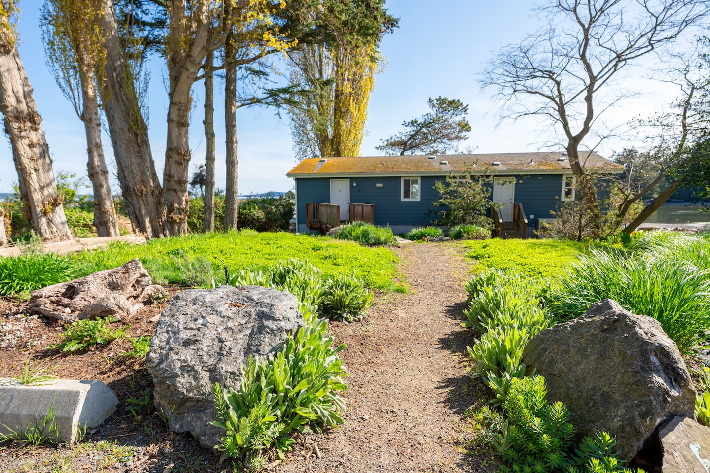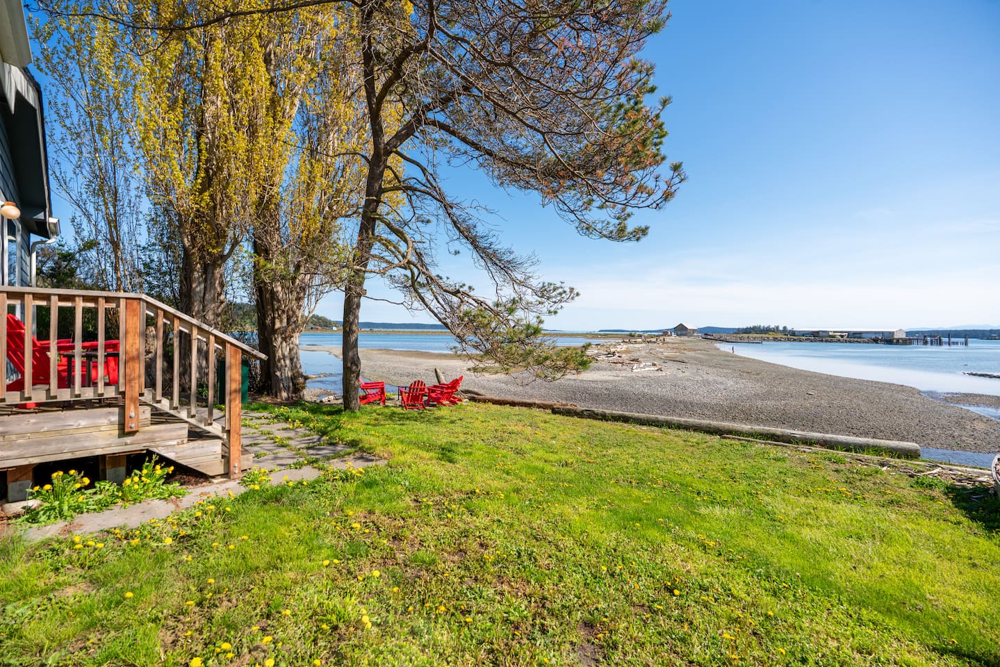 This two-bedroom cottage is just a mile from the town of Friday Harbor but offers a perfect way to get away from it all with a lush back yard that looks out over the bay with incredible views of Jackson Beach. At low tide you can step off the sea wall on the property and walk across to explore to your heart's content. When you're done with your day, the sound of gently running water outside will lull you to sleep Fiber internet connection allows your whole family to work or remote school.