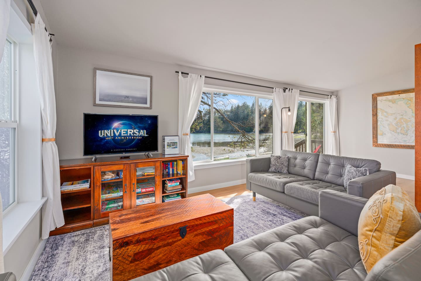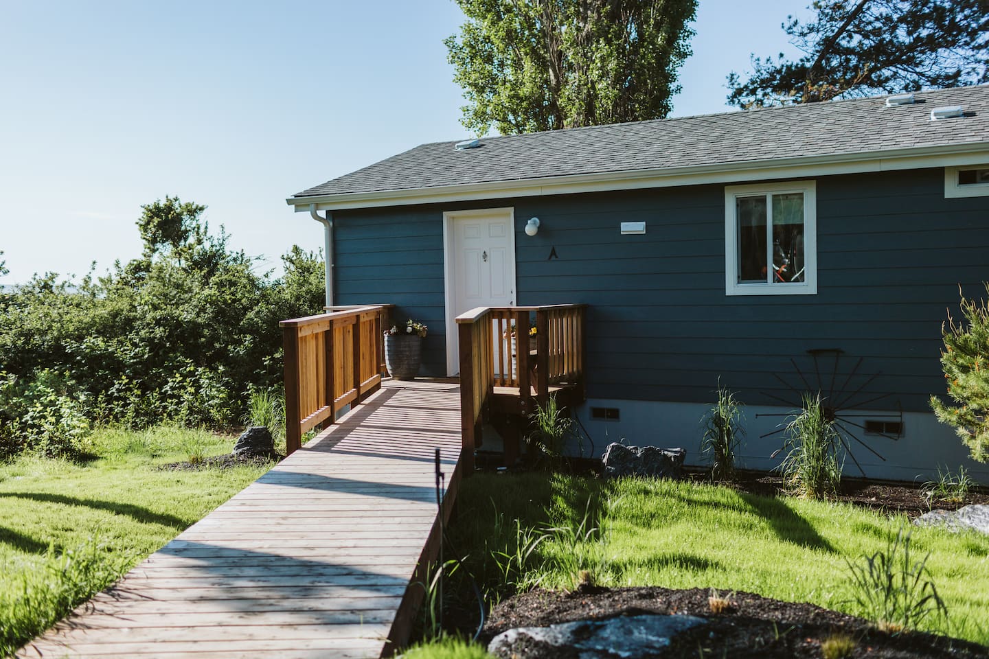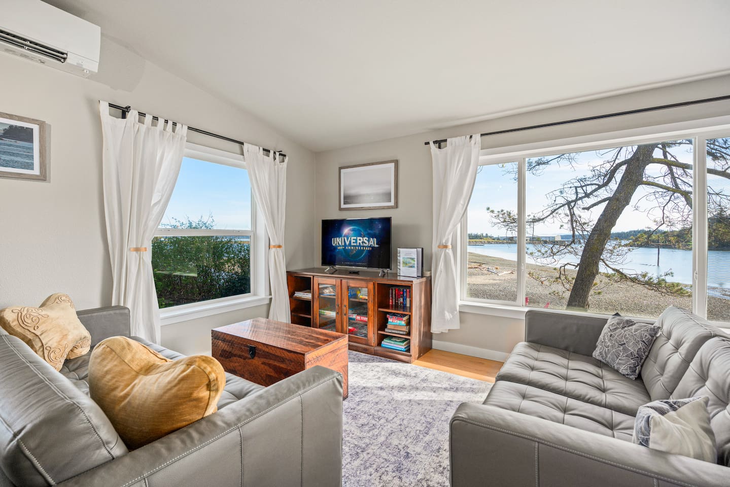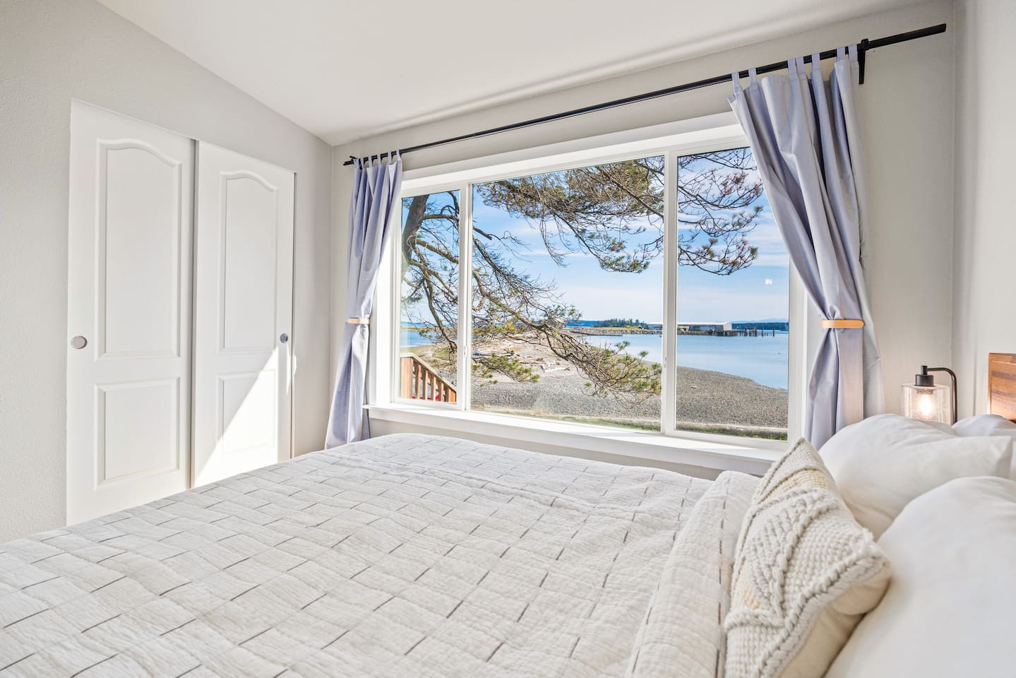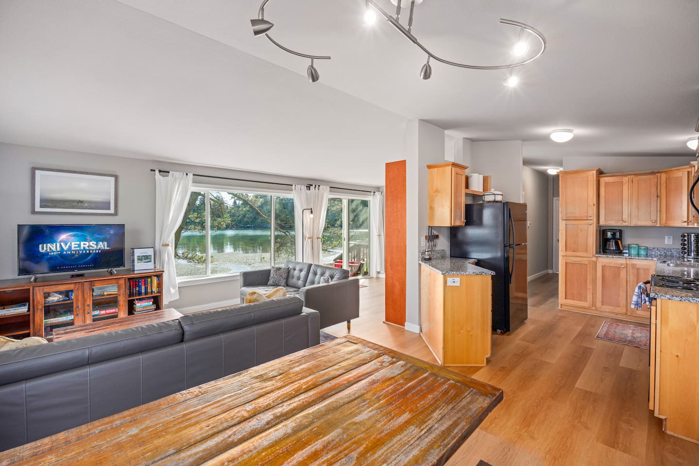 This two-bedroom cottage is just a mile from the town of Friday Harbor but offers a perfect way to get away from it all with a lush back yard that looks out over the bay with incredible views of Jackson Beach. At low tide you can step off the sea wall on the property and walk across to explore to your heart's content. When you're done with your day, the sound of gently running water outside will lull you to sleep Fiber internet connection allows your whole family to work or remote school.