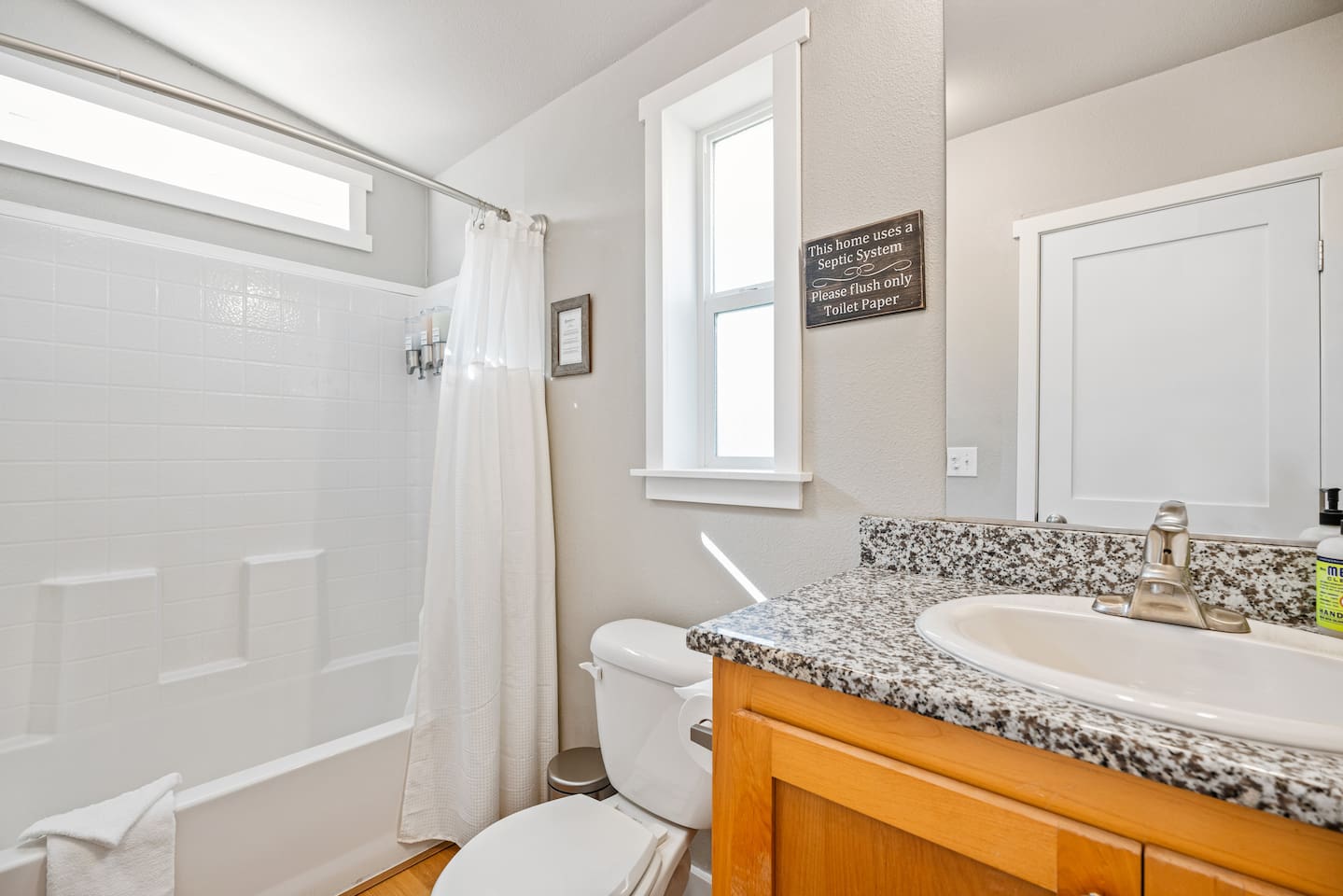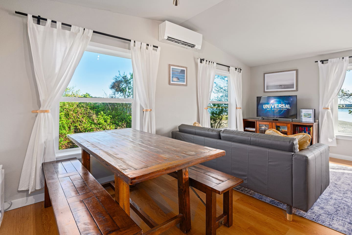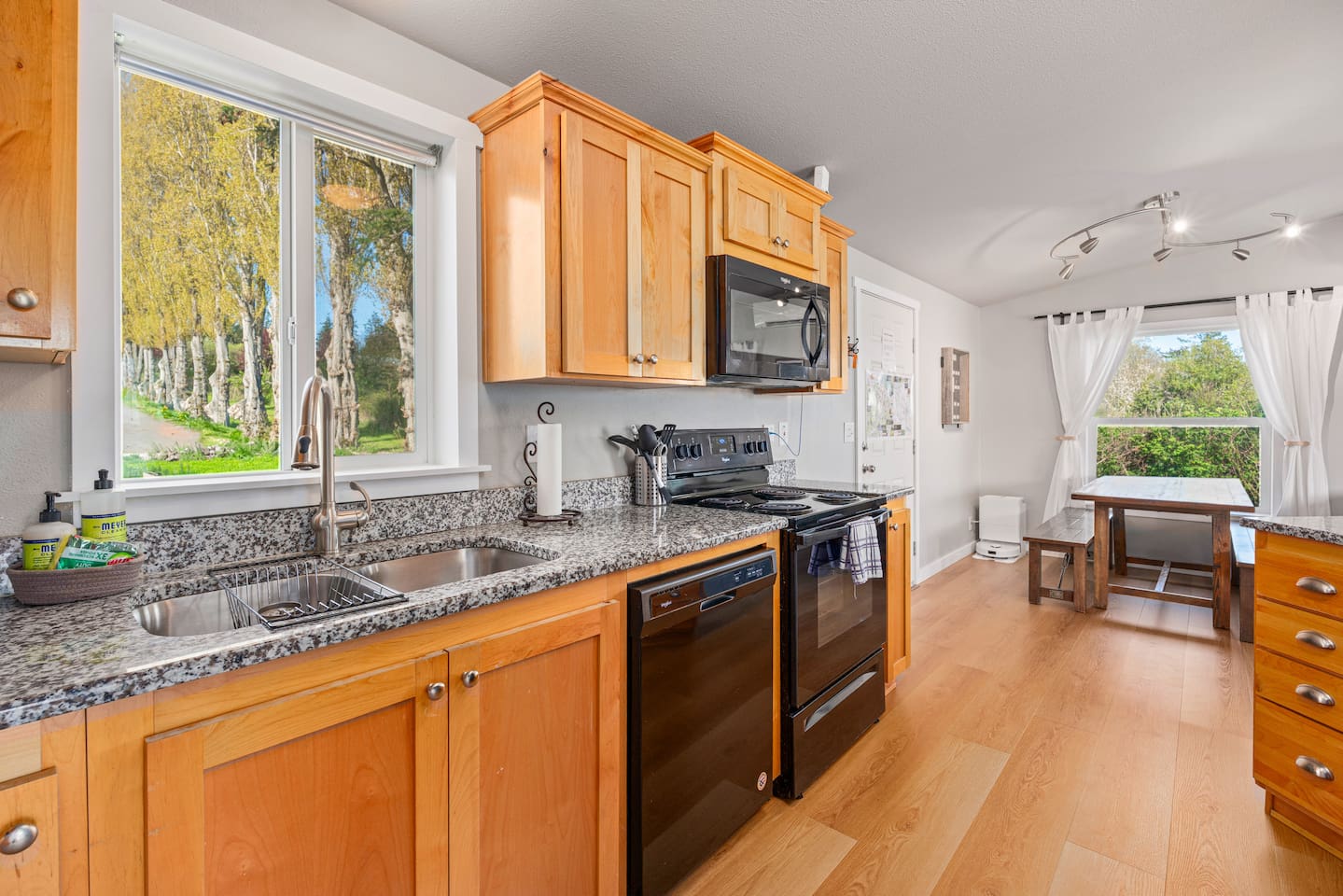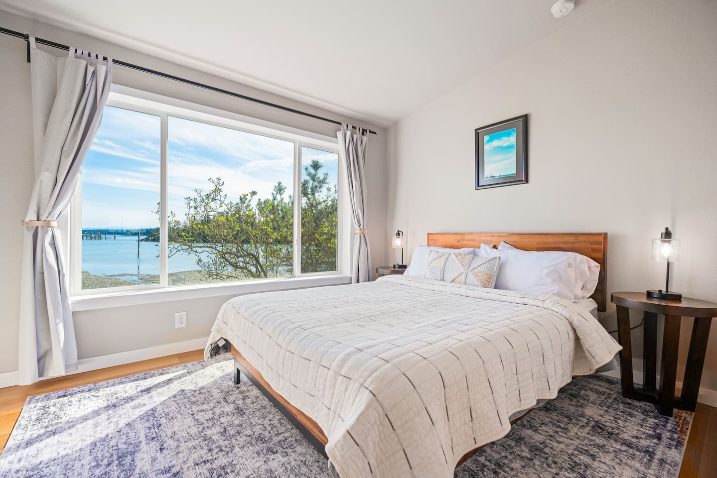 This two-bedroom cottage is just a mile from the town of Friday Harbor but offers a perfect way to get away from it all with a lush back yard that looks out over the bay with incredible views of Jackson Beach. At low tide you can step off the sea wall on the property and walk across to explore to your heart's content. When you're done with your day, the sound of gently running water outside will lull you to sleep Fiber internet connection allows your whole family to work or remote school.